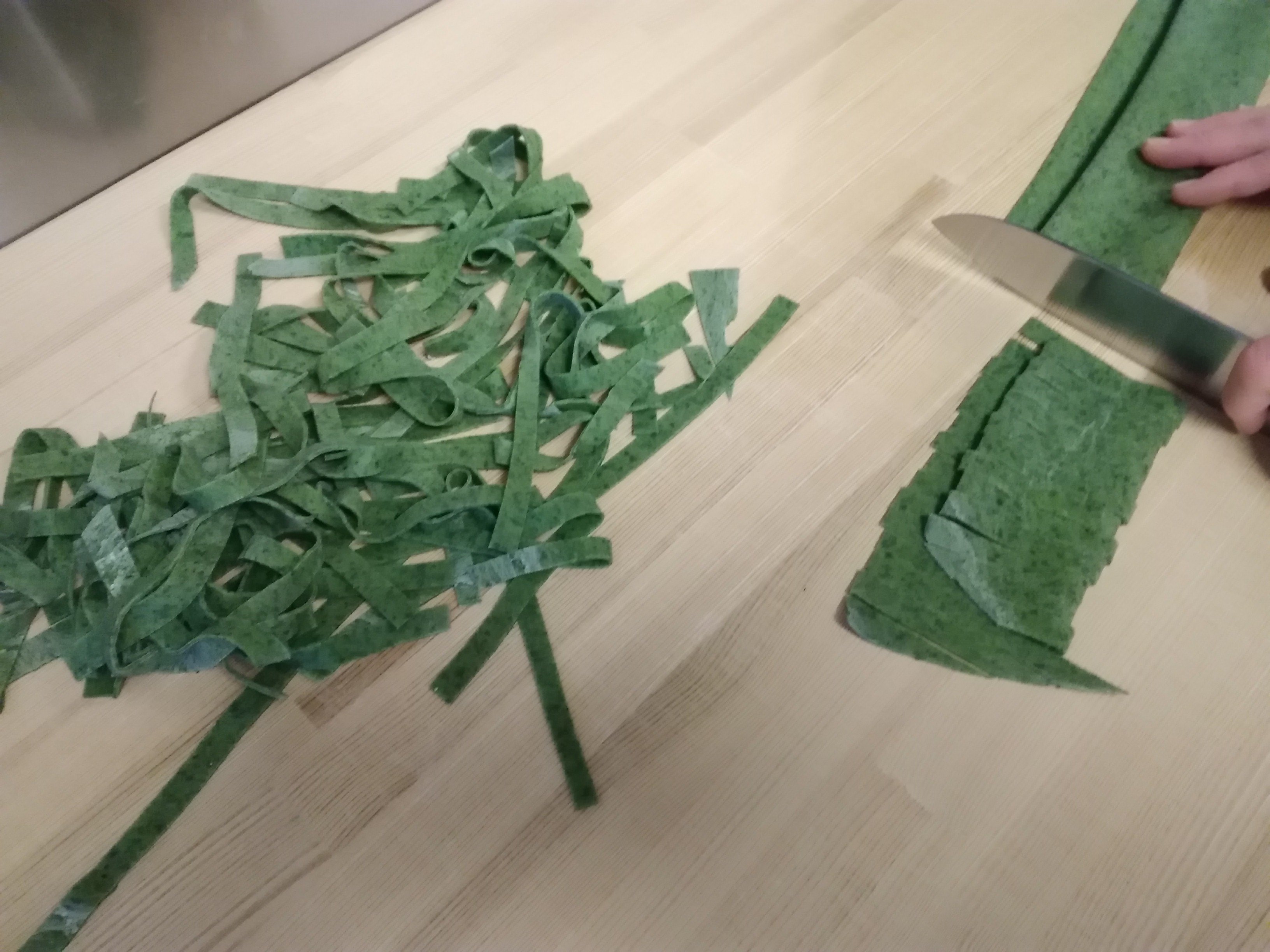 イタリア産と国産小麦粉、卵、塩で作り上げたパスタ生地を、長い専用麺棒でうすく大きくのばします。
